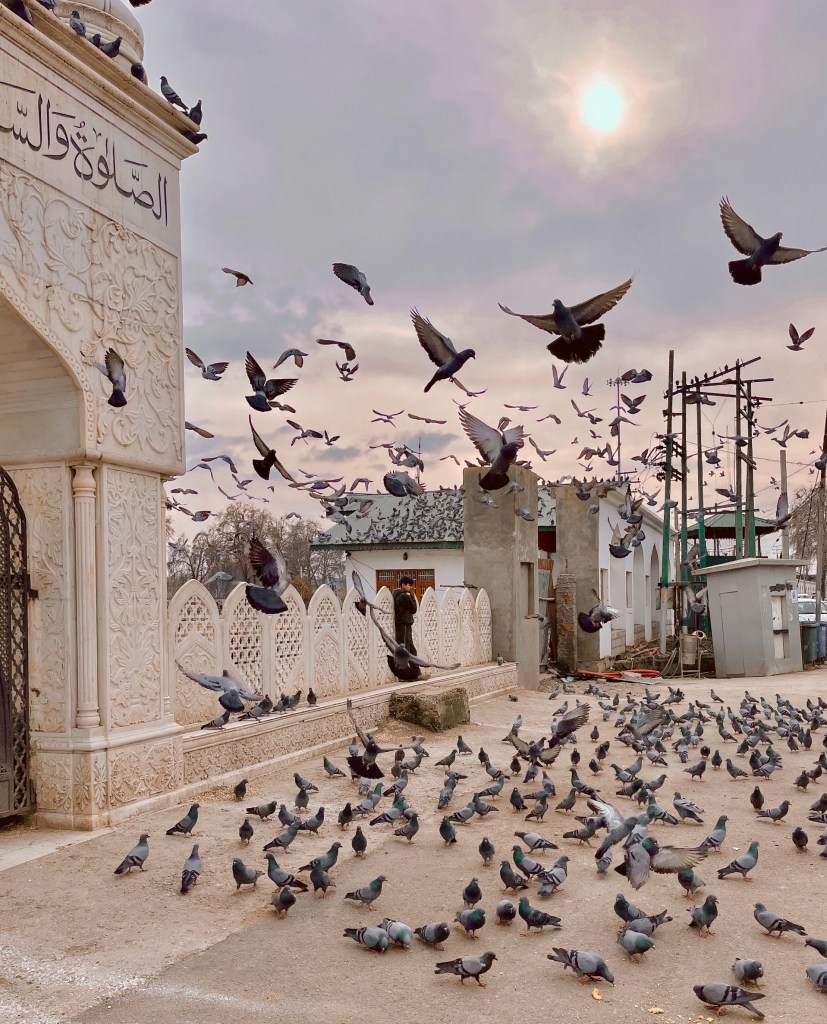 There is a separate section for men and women in the shrine, however only men are allowed in the inner prayer hall. Women must cover their head, arms and legs when visiting the shrine. Carrying a scarf at all times is a good idea in Kashmir. Don’t use mobile phones or eat and drink inside the shrine and please adhere to the strict rules. If you are lucky you might get to photograph a flock of numerous pigeons against the backdrop of Dargah.