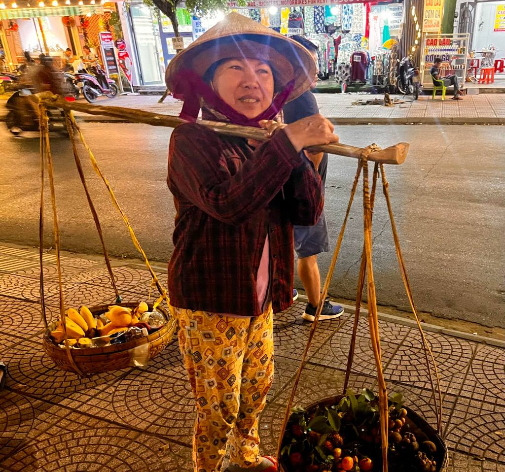 As we strolled through the streets, we saw vendors selling delicious corn cobs and fried ice creams. We were also captivated by the sight of women wearing traditional bamboo conical hats, gracefully carrying bamboo baskets filled with fruits from a pole. This reminded us of Vietnam’s rich culture and traditions.